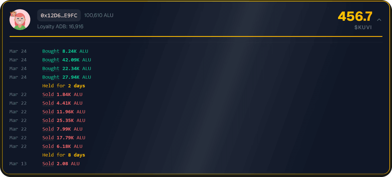 The program operates on a proprietary metric called the Loyalty Average Daily Balance (Loyalty ADB). This score reflects both the size and duration of your $ALU position relative to your baseline at the time of entry. Your share of each seasonal reward pool is determined proportionally based on your Loyalty ADB score relative to all other participants.
